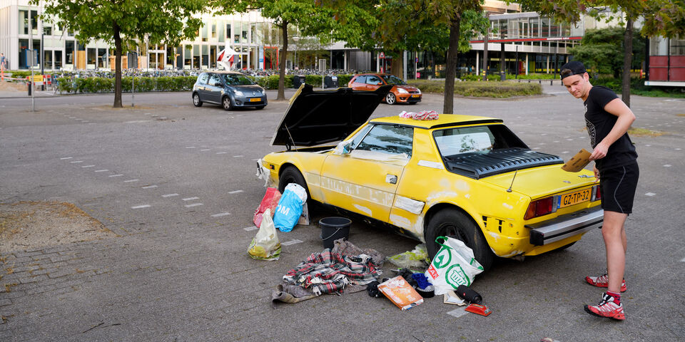 Our photographer went to campus Monday evening and ran into Rick Peters, who sat surrounded with old rags and plastic bags containing tools and other materials. The Master’s student Sustainable Energy is working on his 40-years young Fiat X1/9, which his grandfather gave him a few years ago. A car with two sides, we find out - sweet, happy and Spartan at the same time.
