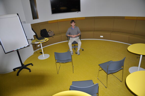 Fysiotherapeut Frits Niemans vindt de ronde zaal met de naam Energy Forum in het MetaForum wel een geschikte plek voor zijn happening Body&Mind. In kleine groepen biedt hij een ‘oppervlakkig prakje’ aan van een mix van mindfulness, ademhalingstechniek, autonome training en progressieve spierrelaxatie. Het komt er op neer dat hij deelnemers tien tot twaalf minuten laat luisteren en ademhalings- en aandachtsoefeningen laat doen. “Ik zie veel medewerkers hier aan de TU/e die de lat voor zichzelf erg hoog leggen voor wat betreft eigen prestaties. Bij hen kunnen fysieke klachten ontstaan die eigenlijk een oorsprong hebben in spanning. De ademhaling kan haperen of de spieren in nek en schouders doen pijn. Body&Mind-activiteiten zijn gericht op ontspanning. Concentreer je in het nu en heb geen aandacht voor zorgen voor morgen of problemen van het verleden.”