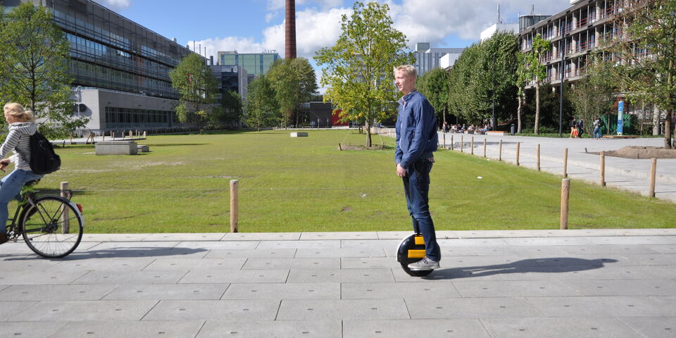 Het meeste opzien op de Groene Loper baart student Electrical Engineering Ivo Rooijackers. Zonder zichtbaar iets met armen of benen te doen gaat hij hàrd (17 kilometer per uur) op zijn elektrische eenwieler voorbij. Hij staat rechtop op twee pedalen aan zijn omhulde wiel. Hoe komt hij eraan? “Ik kijk vaak voor de gein op Chinese websites. Daar was ie te koop voor vijfhonderd euro. Sinds EE in Flux zit is het best ver lopen voor mij. Ik kom met de trein uit Oirschot.” Een groot voordeel van de zeven kilo wegende airwheel is dat hij in een kluisje past. Voordeel van de Groene loper is dat die helemaal rolstoelvriendelijk is, zeg maar airwheelvriendelijk.