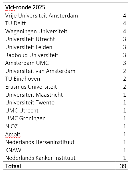 Van de 384 vooraanmeldingen die NWO voor Vici-ronde 2025 binnenkreeg is 10 procent gehonoreerd – 2 procentpunt minder dan vorig jaar. Er gaan 18 beurzen naar vrouwen en 21 naar mannen. Bij zowel de Vrije Universiteit Amsterdam, de TU Delft als de Wageningen Universiteit vallen vier onderzoekers in de prijzen.