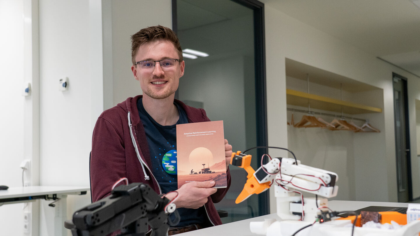 “Het mooiste aan dit onderzoek vind ik dat je een algoritme bouwt en dan echt kunt zien dat de robot doet wat hij moet doen. Dat is het moment dat het allemaal tastbaar wordt, en dat vind ik geweldig”, aldus de promovendus.