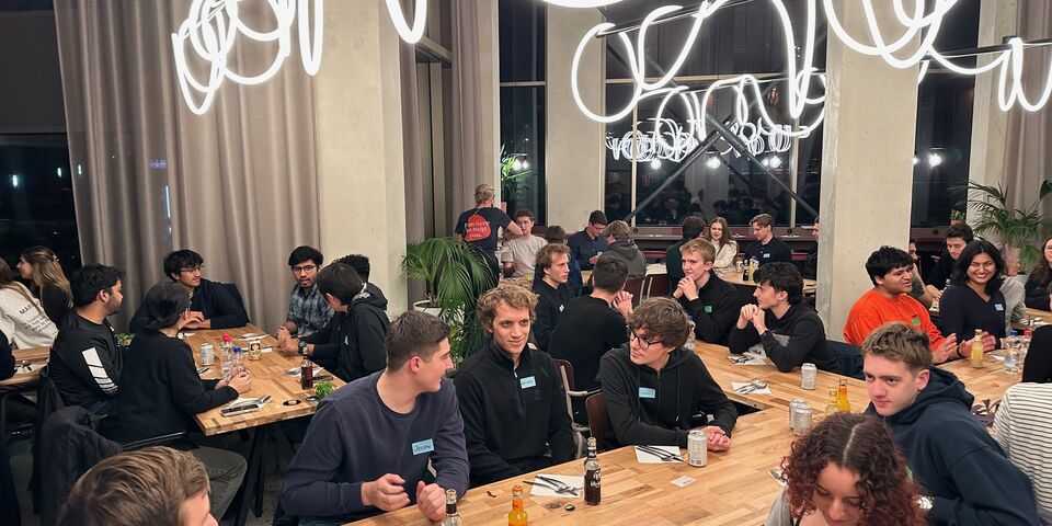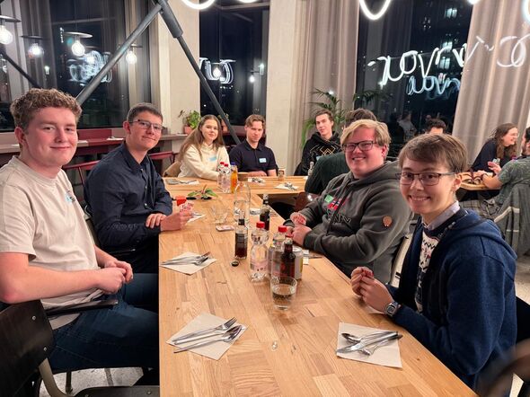 Achterin zit Leander Pronk. Hij heeft een stok kaarten meegenomen. “Altijd handig om bij je te hebben als de gespreksstof opraakt.” Toch lijkt dat aan zijn tafel niet direct het geval. Het is gezellig met twee nieuwe tafelburen: Yaswant Rajasekaran uit India en Timo Branke uit Duitsland én Engeland. “Maar een spelletje spelen kan ook gewoon gezellig zijn”, zegt Pronk. De tafelgenoten knikken.