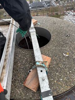 Aan de balk hangt nu een bak, die in de schoorsteen als lift dient. Vanuit die bak kunnen de drie medewerkers van schoorsteen- en ovenbedrijf Harm Meijer uit Groningen komende tijd hun werk doen.