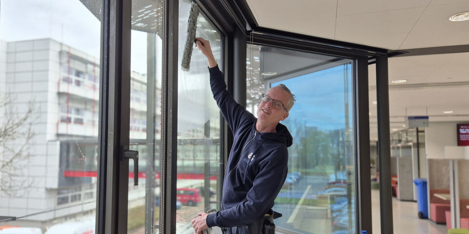 “Samen met collega Marcel Sprengers maak ik alle ramen twee keer per jaar schoon. Dan heb ik het over gevelglas aan de binnen- en buitenkant, separatieglas en de loopbruggen. Vogelpoep, vingerafdrukken en stof – het moet er allemaal vanaf.