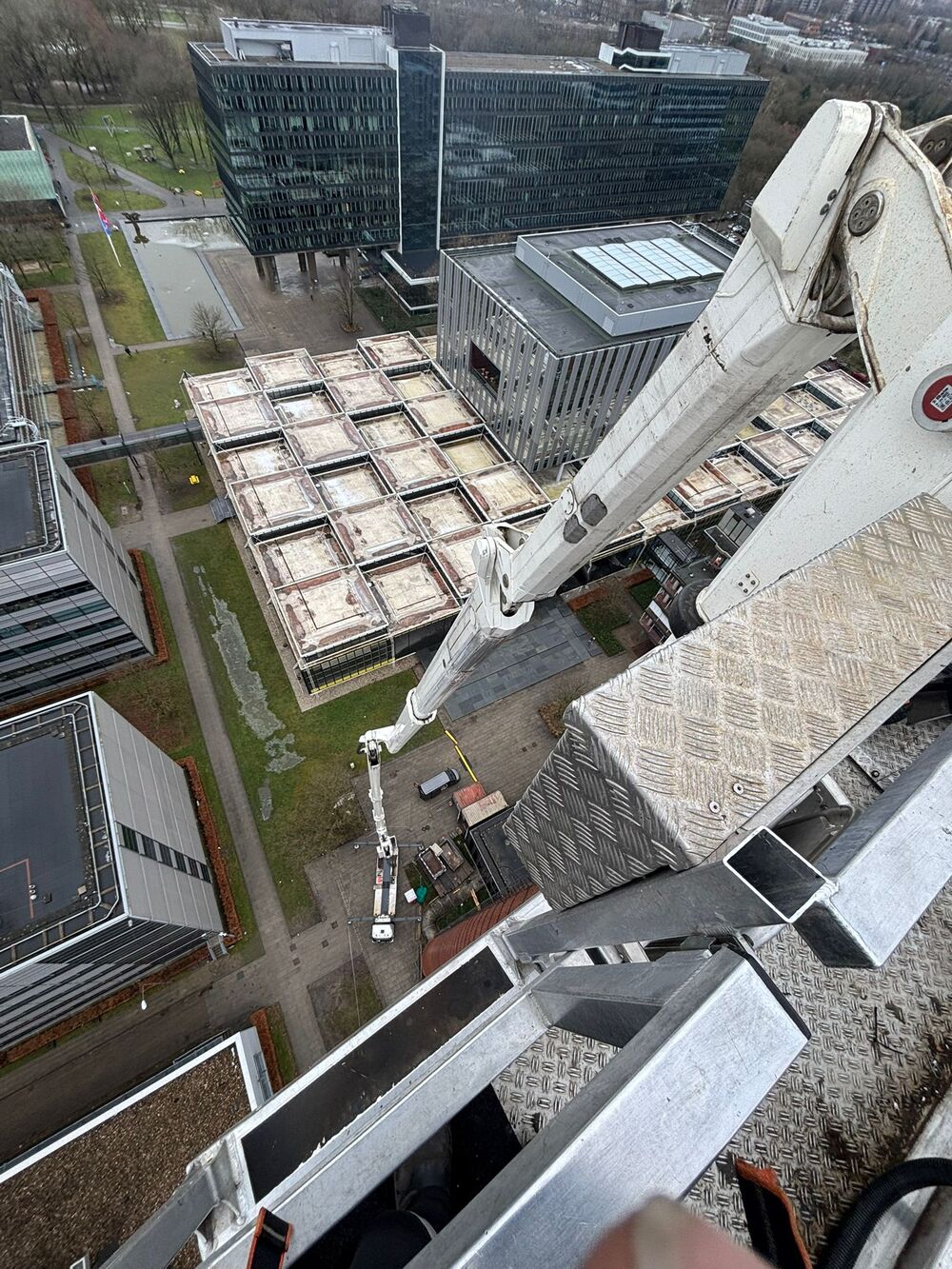 In four weeks, the aerial work platform will return to campus to remove the crossbeam from which the internal lift is suspended. Maintenance of the outside of the chimney is scheduled for 2027. At that point, Meijer will, among other things, refurbish the paintwork on the iron bands and the outside climbing irons.