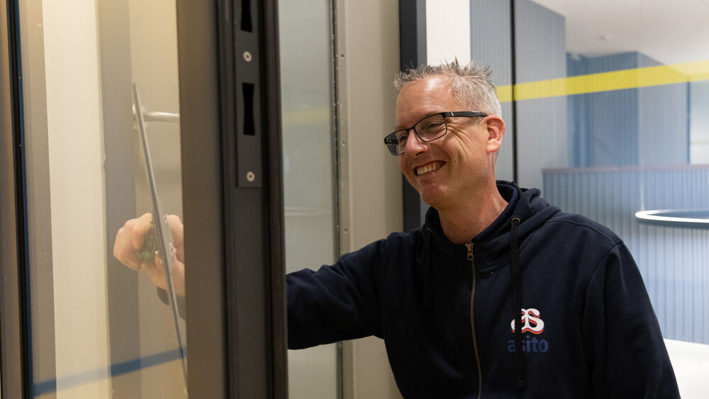 “I already had my own one-person cleaning business, mainly focused on window cleaning. During the COVID period, that became difficult—people started cleaning their own windows. And since I now have a family, I really wanted a permanent job. As you get older, you get wiser, I guess. First I worked for Asito cleaning at the Dommelsch brewery, and when they offered me a job as a window cleaner on this campus, I said yes.”