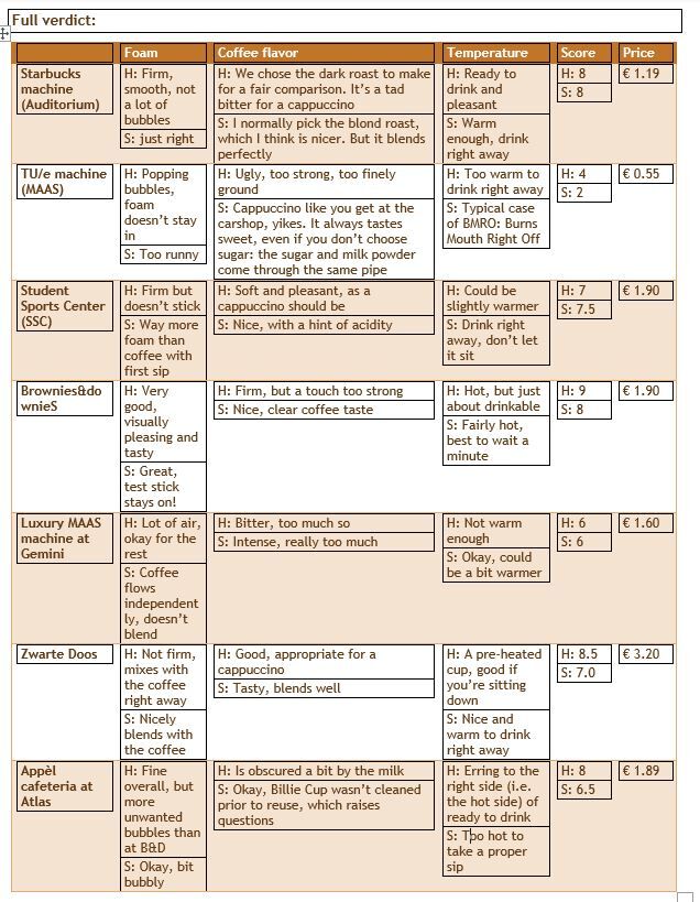 The cappuccinos we tested were purchased at Brownies&downieS, the Student Sports Centre, De Zwarte Doos, the Appèl cafeteria in Atlas, the TU/e machine, the Starbucks machine in the Auditorium and the unnamed luxury machine in Gemini (Floor 1). We didn’t test the cappuccinos blind, but we promise we don’t own shares of any of the companies involved.