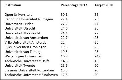 In 2015 all the universities established how many women professors they wanted to have in 2020. The universities of Leiden, Maastricht and Nijmegen had already reached their target by the end of last year. Four universities will probably not manage to do so, despite their high ambitions, believes the LNHV: Erasmus University Rotterdam, TU/e, University of Twente and Wageningen University.