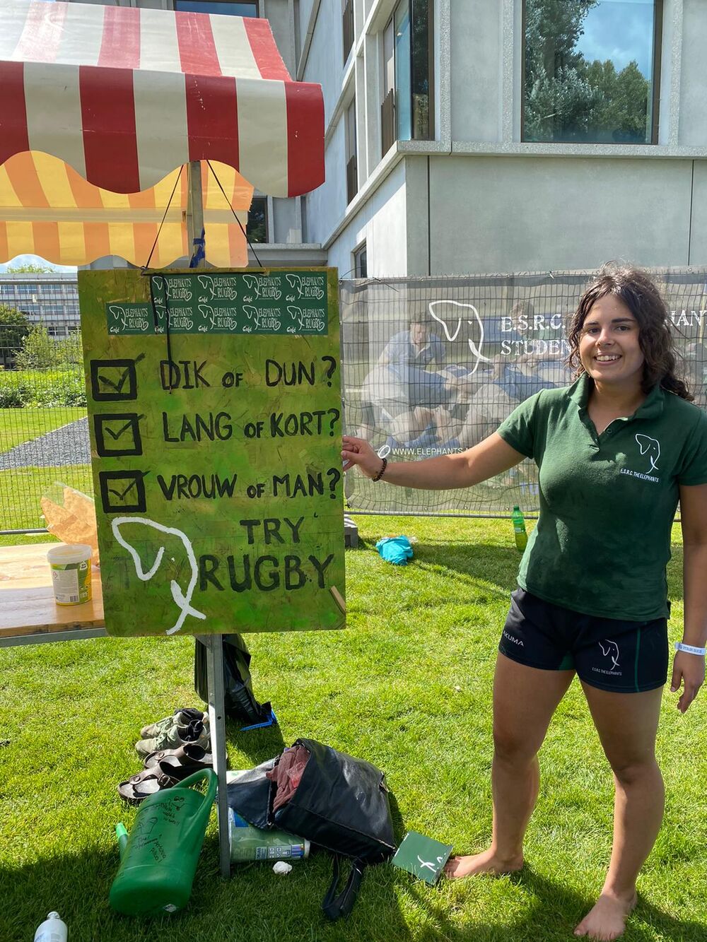 If you need to cool off, you can slide on over (pun intended) to the soap tackle track laid on by The Elephants. The rugby association is at the campus market with a clear message: rugby is not only for big, broad-shouldered lads. Louise de Laat proudly displays the sign that reinforces this message, as does a demonstration on the floor: