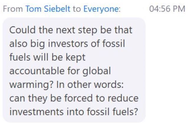 In line with this, Tom Siebelt wants to know what will happen next, also when it comes to investments. “There is a fear that Shell will sell part of its polluting industry. However, that’s easier said than done, because the ruling is valid all over the world. Investors are therefore at a great risk, and they will ask themselves whether such an investment is of interest to them in the long term,” De Pater says.