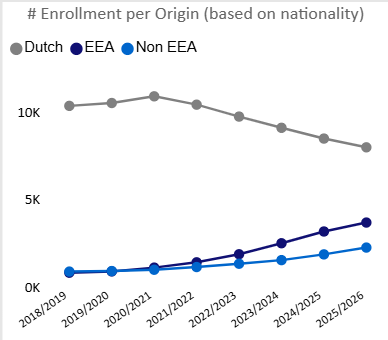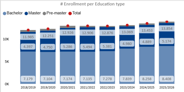 This increase is entirely driven by international students: enrollment from both the European Economic Area and beyond Europe is rising sharply, while the number of Dutch students is declining slightly. In this way, TU/e stands out from the national trend, where European student enrollment is falling.