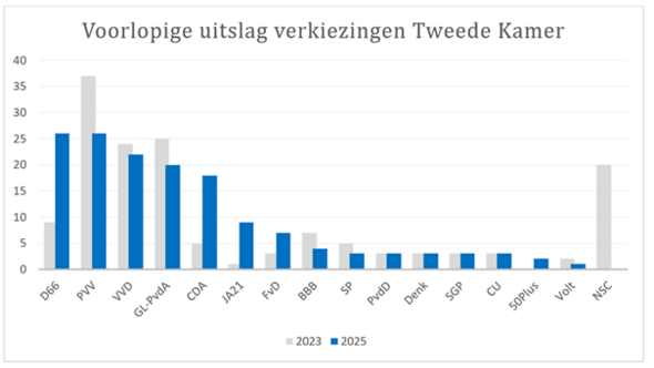 In the preliminary election results, D66 and the PVV are tied, both holding 26 seats. It seems almost inevitable that D66 will join the next government, while the PVV will end up in the opposition benches.