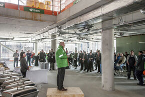 Van Ham bracht verder een toast uit op het aanwezige personeel van BAM Utiliteitsbouw. De werklui blijken weken voor te liggen op schema. Dat is volgens uitvoerder Martijn van den Hoef en projectorganisator Ad Janssen voor een groot deel te danken aan de zachte winter. “Normaal calculeren we een aantal vorstdagen in, maar dat was dit jaar niet nodig.” Daarnaast verloopt de ‘ruwbouw’ sneller dan verwacht. “We hebben van tevoren vijftien werkdagen per verdieping begroot, maar in de praktijk hebben we er maar dertien nodig.” Inmiddels is een begin gemaakt met het plaatsen van de binnenwanden en de vloerafwerking. Hoewel de geplande opleverdatum van het gebouw december is, wordt dat misschien wel een maand vroeger, aldus Van den Hoef.