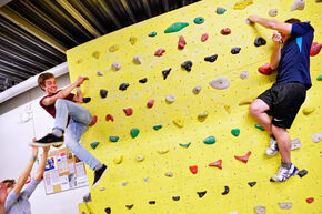 Bram van Kasteren, lid van ESAC, vertelt dat er zelfs speciaal een app is ontwikkeld die de ledemaat- en kleurcombinaties genereert, met wat extra opdrachten (‘linkerhand in de lucht’). Dit, om het nog ietsjes spannender te maken. Wat de deelnemers er van vinden? Als je de mannen van Eindhovense Studenten Turnvereniging Suca moet geloven is het een makkie om een kwartier aan de muur te blijven hangen. Maar direct na hen komt er een groep die al gigantisch moet worstelen om überhaupt óp de muur te komen.