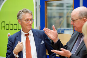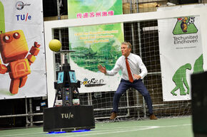 De nieuwe burgemeester van Eindhoven, John Jorritsma, liet zich bij zijn eerste bezoek aan de TU/e van zijn onverzettelijkste kant zien: hij weigerde het doel van Tech United te verlaten voordat hij een penalty had gestopt. De VVD’er werd door collegeleden Jan Mengelers en Jo van Ham donderdagmiddag getrakteerd op een minitour langs onder meer het NanoLab, het Automotive Lab, de operatierobots en het Virtual Reality Lab.