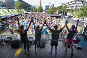 De fanatiekelingen op het podium krijgen de groep toch in no-time in beweging. Oké, niet de hele groep, maar er zijn toch genoeg studenten die enthousiast mee bewegen. Het joggen gaat nog, bij de push-ups krijgen ze het al wat zwaarder en bij de jumping jacks en burpees overstijgt het gekreun bijna de muziek.
