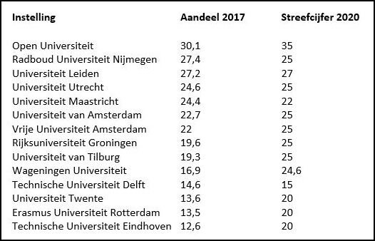 In 2015 hebben alle universiteiten bepaald hoeveel vrouwelijk hoogleraren ze in 2020 wilden hebben. De universiteiten van Leiden, Maastricht en Nijmegen hebben hun doelstelling eind vorig jaar al bereikt. Vier universiteiten gaan het ondanks hun hoge ambities waarschijnlijk niet halen, denkt het LNHV: de Erasmus Universiteit, de TU/e, Universiteit Twente en Wageningen Universiteit.