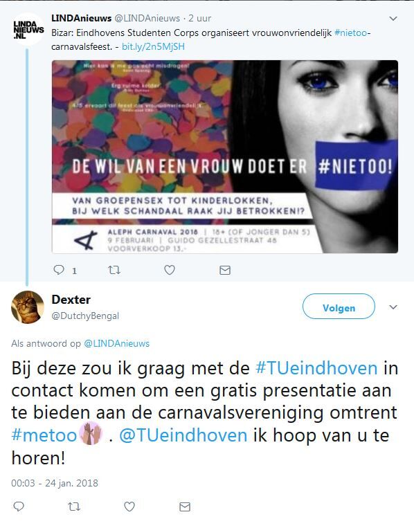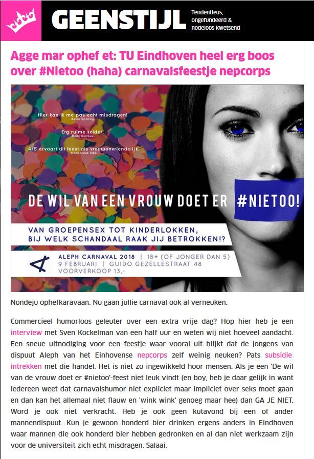‘De wil van een vrouw doet er #NieToo!’ Met die uitsmijter eindigt de aankondiging. Voorafgaand hieraan zijn zeer vrouwonvriendelijke passages te lezen, zoals in de aanhef: ‘Uit onderzoek blijkt dat 3 van de 4 vrouwen zich vandaag de dag wel eens aangerand voelt. Wij, van hét Dispuut Aleph, vinden dit natuurlijk schitterend. Dat wij sinds 1958 vrouwen ongevraagd mogen betasten is een luxe waar andere mannen niet van mee kunnen genieten.’