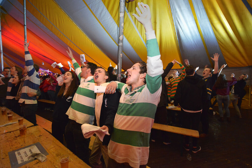 Het inkoopbeleid van de studentengezelligheidsvereniging voor het jaarlijkse zangfestijn was strak, bleek vrijdag aan het einde van het evenement toen de drankbalans werd opgemaakt. “Op één fust na is al het bier erdoorheen gegaan”, vertelt SSRE-bestuurder Daan Hommersom, die ondanks zijn krappe drie uur slaap verrassend fris klinkt als Cursor hem zaterdagochtend spreekt. Een krappe tweeduizend liter - gedistribueerd in groene gieters - tikten de aanwezigen in drie uur tijd weg. “Ik denk dat er op dit moment nog wel wat mensen in bed liggen.”