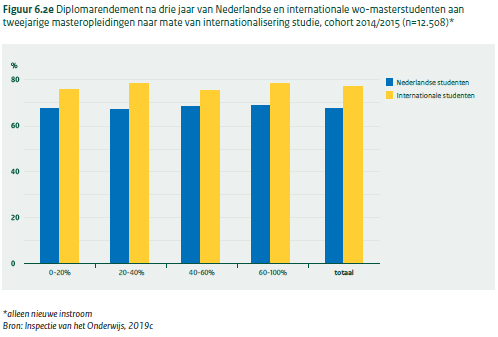 Ook in de universitaire masterstudies doen ze het beter. Bijna tachtig procent behaalt zijn diploma met hooguit een jaar uitloop, tegen bijna zeventig procent van de Nederlanders. Het aantal Nederlandse wo-studenten dat met hooguit een jaar uitloop zijn masterdiploma behaalt, wordt bovendien niet hoger of lager als er meer internationals bij hen in de collegebanken zitten.