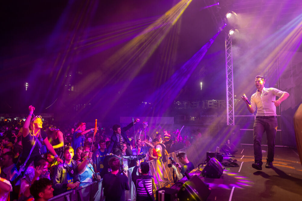 De avond brengt alle introgroepjes weer samen op de campus, op het Flux-veld, waar de dag wordt afgesloten met dj het Hitjeskanon, Zanger Kafke (‘Springen’), Kav Verhouzer (‘Stap voor stap’) en enkele verenigings-dj’s. Stuk voor stuk vuren ze hun feestelijke krakers af op het publiek en trekken ze de laatste introgangers uit hun woensdagdip. Klaar voor de nacht - wat die jullie heeft gebracht, horen we graag morgen!