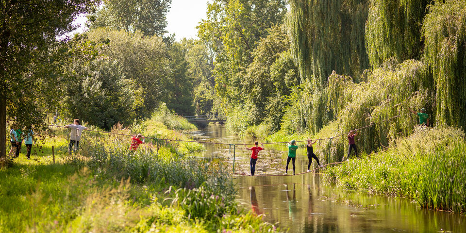 Een totaal andere setting treffen we iets verderop aan, waar introkids op brugleuningen staan, over obstakels manoeuvreren, vanuit een over het water hangende autoband vanuit de Dommel naar boven klimmen en zich al rennend van het een naar het ander begeven. Het meest uitdagende onderdeel van deze workshop van All Terrain, in ieder geval vanaf de kant bekeken, lijkt een over de Dommel gespannen net te zijn. Deelnemers moesten op hun buik over een touw kruipen om bij een net te komen, om vervolgens hangend onder een ander touw weer naar de kant te komen. Toen er eenmaal een schaap, uh introkid, over het touw was, volgden er al snel meer. En met wat aanwijzingen lukte het de meesten om de overkant goed te bereiken- al was dat soms met trillende benen en handen. De deelnemers hielden het daar niet droog bij, maar gelukkig scheen de zon volop.