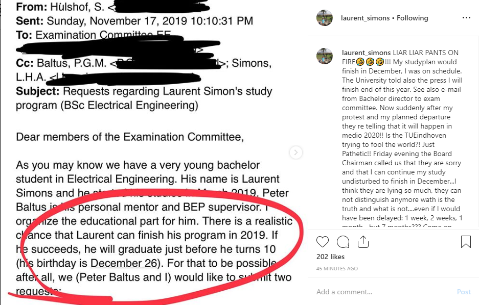 In haar reactie zegt de universiteit verder: 'We hebben als universiteit bijzonder veel maatwerk geleverd om Laurents snelle studiepad te faciliteren. Dat heeft een grote investering gevergd van docenten en medewerkers die toch al met hoge werkdruk te maken hebben. Het is spijtig dat dit maatwerk niet resulteert in een goede afronding van de opleiding. We zijn er trots op dat onze medewerkers, en vooral Laurents mentor hoogleraar Peter Baltus, met grote toewijding Laurent begeleid en geholpen hebben. Zijn begeleiders hebben met veel plezier met hem gewerkt, niet alleen vanwege zijn enorme talent, maar ook omdat het een zeer sympathieke en leergierige jongen is. De deur staat daarom nog open voor het hervatten van de opleiding, onder realistische voorwaarden'.