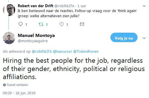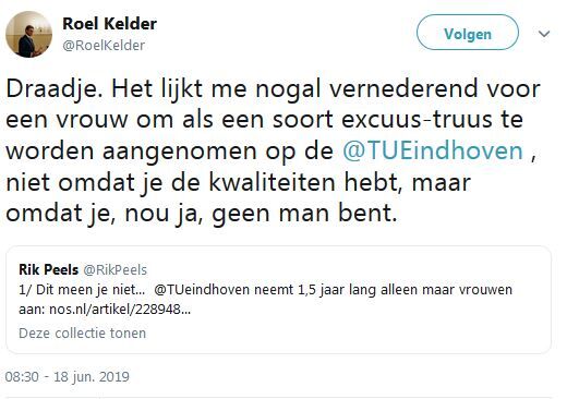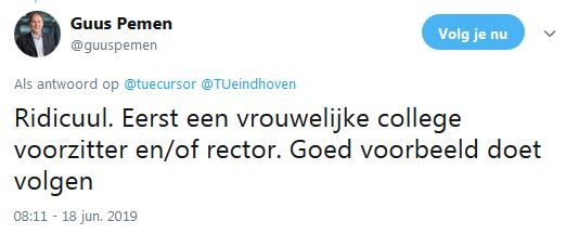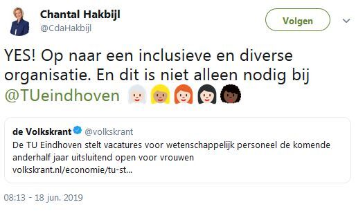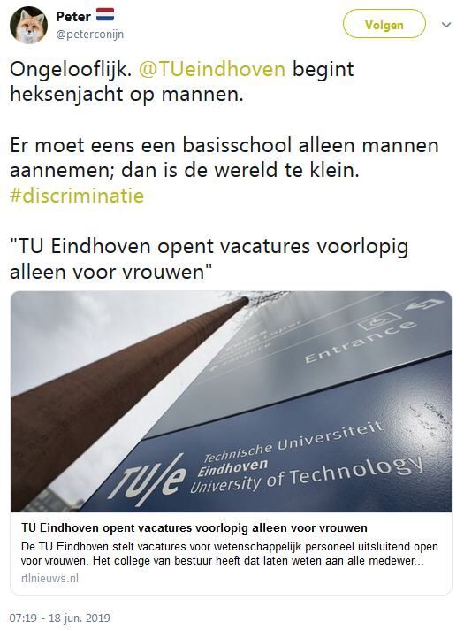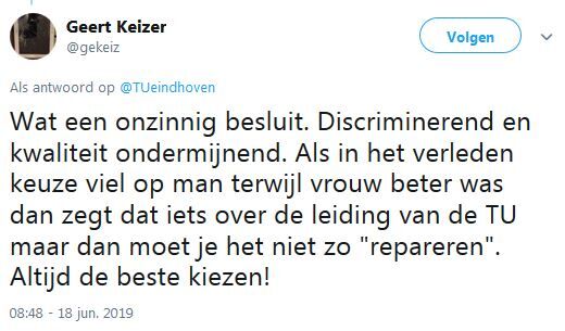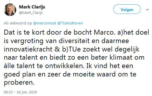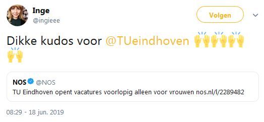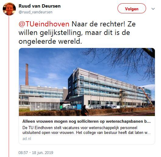 Bij de zoektocht naar nieuwe wetenschappers richt de TU/e zich vanaf 1 juli in het eerste half jaar van het wervingstraject enkel op geschikte vrouwelijke kandidaten. Tot eind 2020 geldt deze maatregel voor honderd procent van alle vacatures, daarna wordt jaarlijks bekeken welk percentage van de openstaande vacatures nog onder de regeling komt te vallen. De U-raad vroeg gisteren aan het College van Bestuur erop toe te zien dat de regeling geen discriminatie of intimidatie tot gevolg gaat hebben.