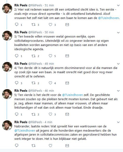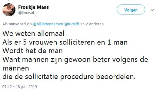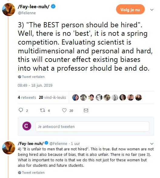 Ellen Konijnenberg, lid van personeelsfractie PUR, plaatste maandagmiddag in de U-raadsvergadering bij het positieve advies voor de maatregel toch enkele kanttekeningen namens de Commissie Personeelsbeleid. Zo liet ze weten dat de raad de maatregel in eerste instantie als discriminatoir had beschouwd en dat de maatregel daarom ook negatief ontvangen was. Konijnenberg: "Echter, we erkennen dat eerdere maatregelen niet het gewenste resultaat hebben gehad op het gebied van diversiteit en dat striktere maatregelen - zoals de nu voorliggende - noodzakelijk zijn om het doel van een evenwichtige representatie te bereiken. Verder denken we dat een verhoging van het aandeel vrouwelijke universitair docenten, universitair hoofddocenten en hoogleraren positief zal werken op het aantrekken van vrouwelijke studenten."