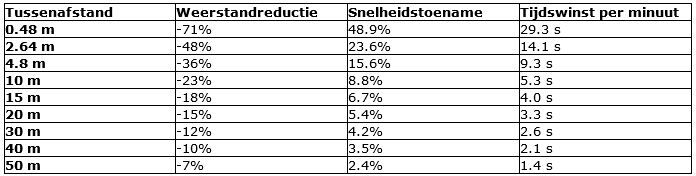 Bovenstaande tijdswinsten zijn berekend en gemeten zonder tegenwind, rugwind of zijwind. Blocken: "Als er tegenwind is, zijn de winsten groter. Als er rugwind of zijwind is, zijn de winsten lager. Hoe sterker de zijwind, hoe moeilijker het is voor een renner om nog in de windluwte achter de motor plaats te nemen."