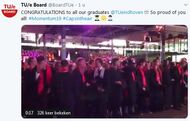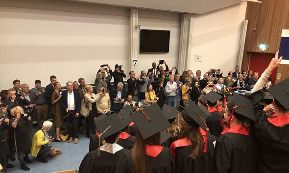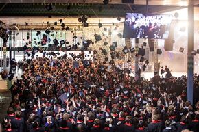 De rector sloot af met een countdown naar "het moment waar jullie allemaal op hebben gewacht. Dus sta op, pak jullie camera's, pak jullie telefoons. Zijn jullie klaar?". En na vijf tellen gingen de honderden zwarte caps van de afstudeerders, vergezeld van confetti, de lucht in.