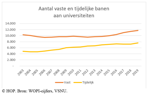 Maar universiteitenvereniging VSNU kijkt er anders tegenaan, laat een woordvoerder weten. Er is immers sprake van een lichte daling van het aandeel tijdelijke contracten, al gaat het “minder snel dan we graag zouden willen”.