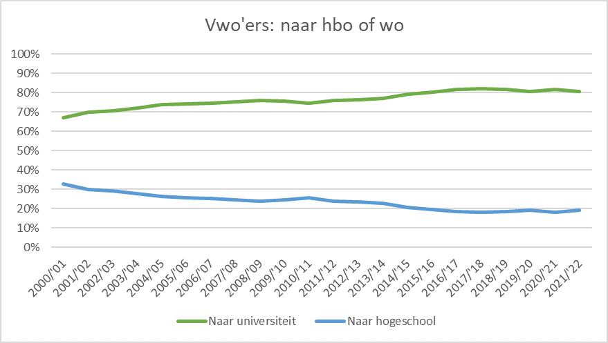 Daarvoor moeten we andere tabellen gebruiken, want die gaan verder terug in de tijd. We nemen het jaar 2000 en kijken naar alle eerstejaars aan de universiteiten en hogescholen (ook als ze niet meteen na hun eindexamen gingen studeren). Van de vwo’ers ging toen 67 procent naar een universiteit en 33 procent naar een hogeschool. Twintig jaar later is dat 81 om 19 procent. Er zit overlap in van dubbelstudenten en switchers, maar de neerwaartse trend is onmiskenbaar.