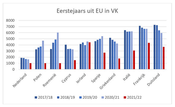 Sommigen van de weggebleven studenten kiezen misschien voor andere landen, zoals Nederland. De invloed van de Brexit – in januari 2020 stapte het VK uit de Europese Unie – is moeilijk te meten, maar de Nederlandse universiteiten zagen het aantal internationale studenten in de bacheloropleidingen toenemen van ruim 15.000 in 2020 naar ruim 18.000 in 2021. In eerdere jaren was er ook groei, maar de sprongen waren iets kleiner.