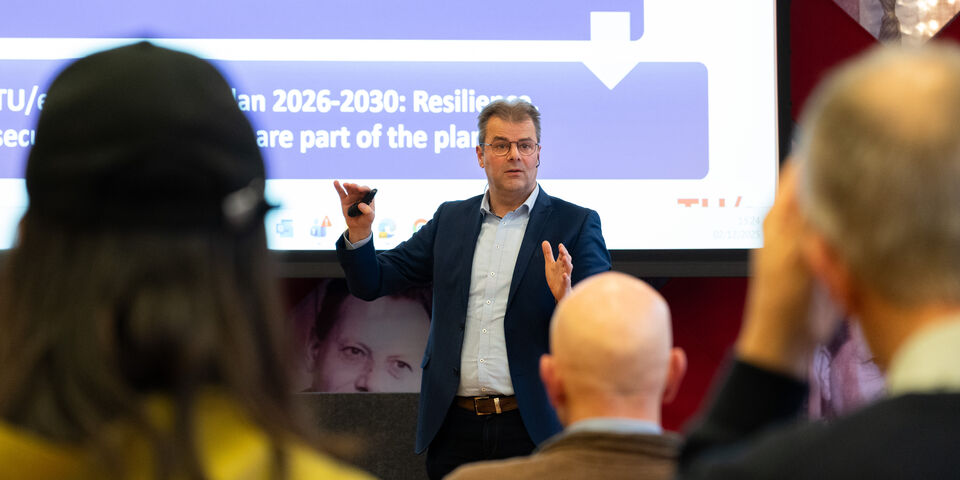 De universiteit voelt zich verantwoordelijk om een bijdrage te leveren aan de veiligheid van Nederland. Met die boodschap opende collegevoorzitter Koen Janssen de eerste universiteitsbrede informatiesessie over weerbaarheid en veiligheid, die grotendeels ging over samenwerken met Defensie. Susan Hommerson van General Affairs en Geert-Jan van Houtum (op de hoofdfoto), decaan van Industrial Engineering and Innovation Science, gaven eerder op verschillende faculteiten al een vergelijkbare presentatie, voor wetenschappelijk personeel.