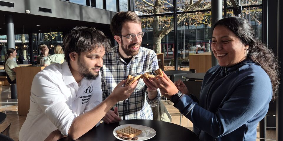 In de Markthal gaan initiatiefnemers Thijs Jenneskens (PhD bij EE), Alfaima Solano (PhD bij IE) en Fontysstudent Mobarak Nathoe donderdagmiddag, samen met andere leden van Plant Based Universities Eindhoven, warme wafels maken. Ze gebruiken daarin ook appelmoes. Het zure daarvan zal met de baksoda het beslag doen rijzen en zo is er geen ei nodig voor een luchtige wafel. Ook voor melk nemen ze een plantaardig alternatief. Er zijn toppings mogelijk met plantaardige slagroom, hagelslag, caramelsaus, blauwe bessen en poedersuiker. Maar belangrijker is de petitie waar ze aandacht voor vragen.