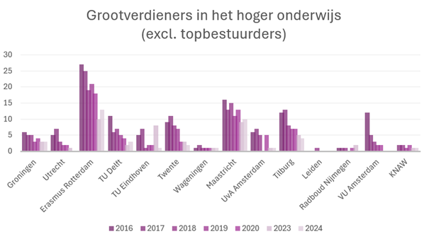 Uit een analyse van de cijfers van DUO blijkt dat het aantal grootverdieners in het hoger onderwijs de afgelopen jaren fors is teruggelopen. Volgens de oudst beschikbare cijfers waren er in 2016 nog 112 niet-bestuurders met een salaris boven de norm. In 2020 waren dit er 64 en vier jaar later 39.