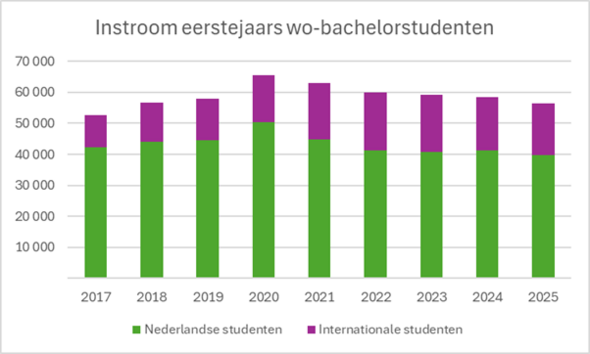 Zo’n 56 duizend bachelorstudenten begonnen in 2025 aan een Nederlandse universiteit. Dat is 3,4 procent minder dan vorig jaar. Voor het vijfde jaar op rij is het aantal eerstejaars afgenomen. Zowel de Nederlandse (3,3) als de internationale instroom (3,6) is gedaald.