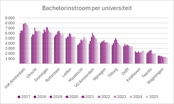 De Universiteit van Amsterdam blijft de grootste universiteit van Nederland, maar verwelkomde dit jaar ruim zeshonderd eerstejaarsstudenten minder dan in 2024. Ook bij de Vrije Universiteit waren het er zo’n vijfhonderd minder.