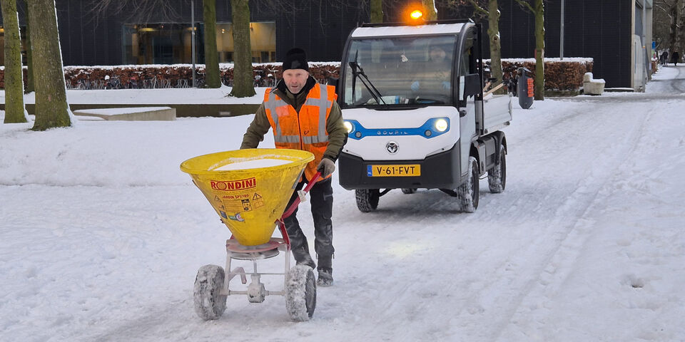 Ondanks inzet van zes medewerkers en een extra schuifwagentje, lukte het op de eerste werkdag van het nieuwe jaar niet om de wegen op de campus vrij te krijgen van sneeuw en ijs. De strooidienst was maandag om vijf uur in de ochtend present, maar dat mocht niet baten.